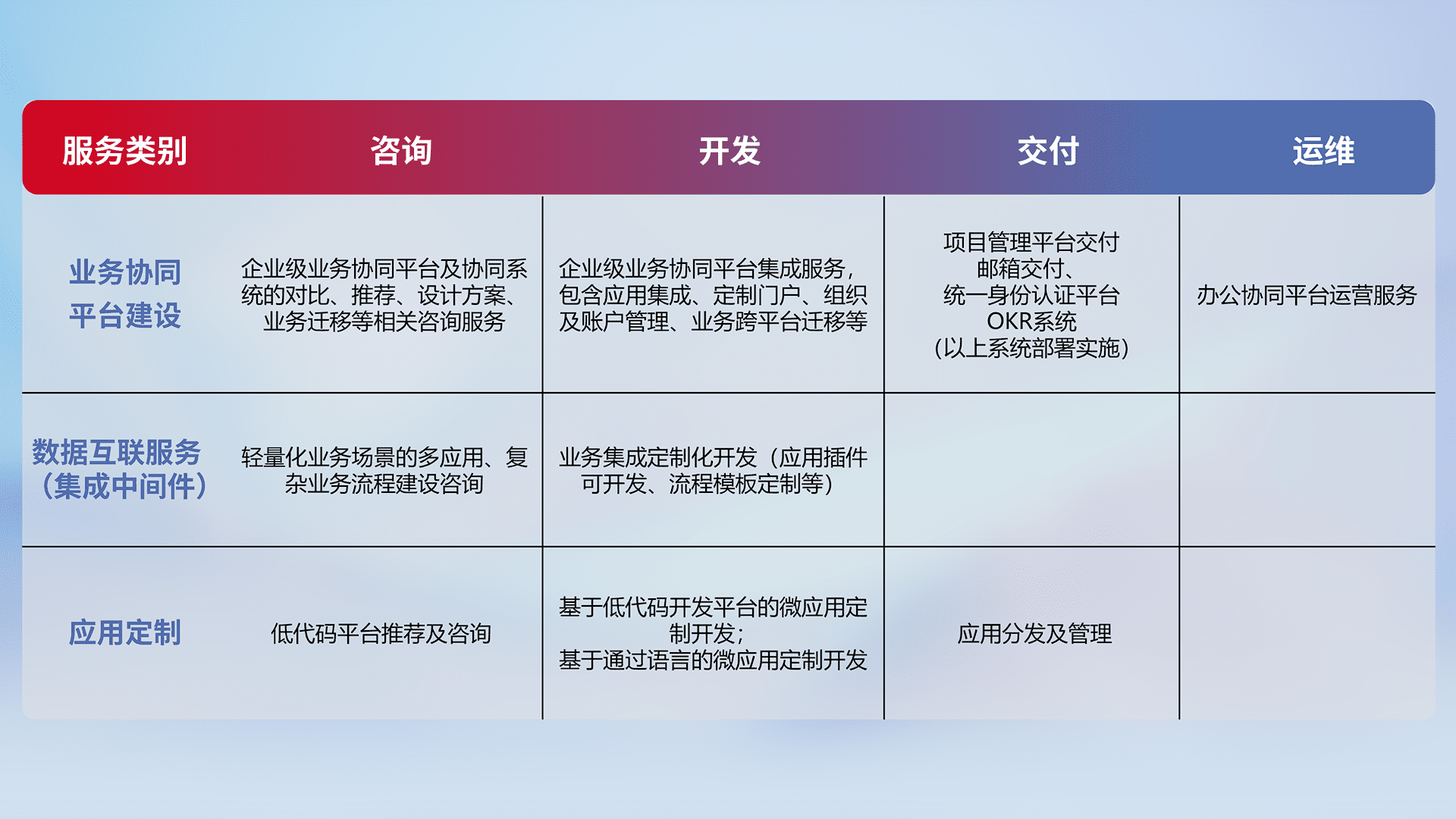 针对钉钉、、、企微、、、、IDaas等平台级产品提供产品的规划、、方案、、、交付、、、、定制化开发等服务,,,,实现如统一协同办公、、、、智能客户服务、、混合会议管理、、、、智能数据查询、、、等业务场景,,实现数字化转型。。。