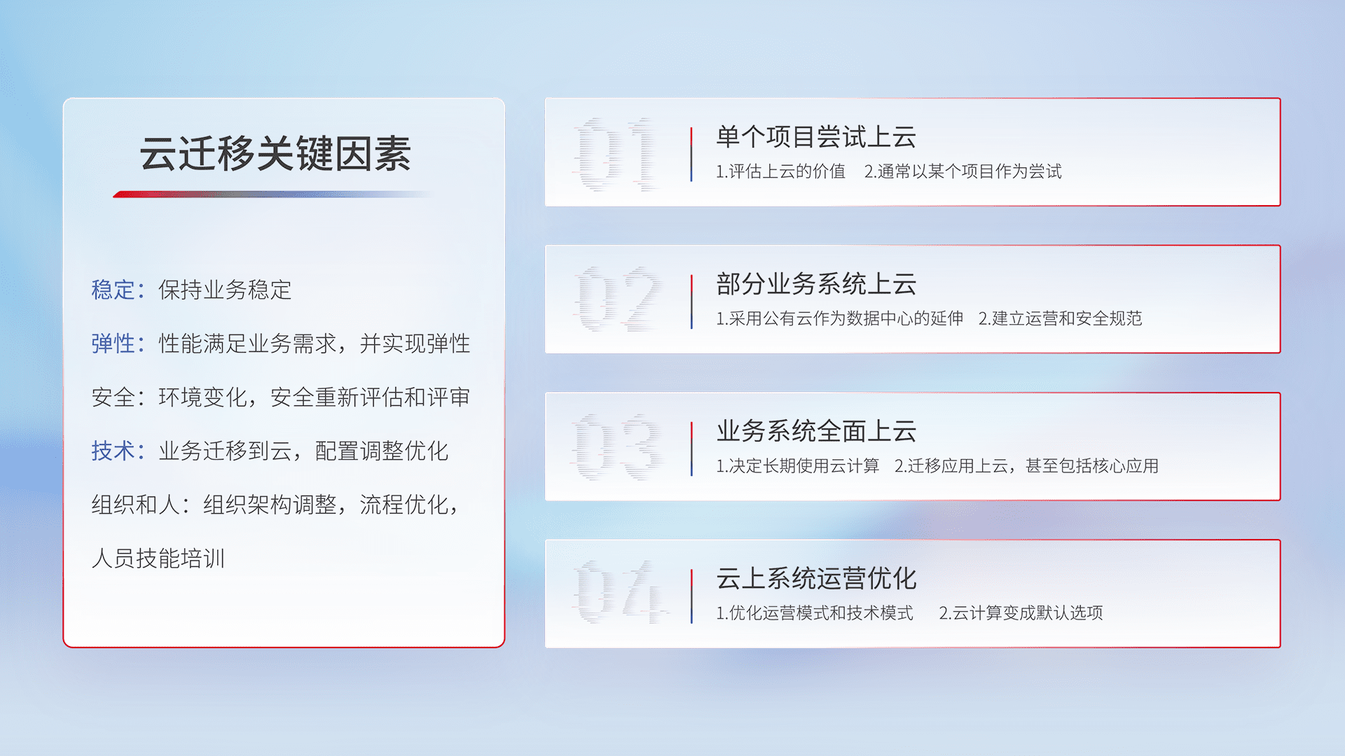 结合实际业务,,,从规划设计、、云平台选型、、云原生改造、、数据迁移、、集成交付,,,,迁移全过程为客户识别最佳上云路径,,,做好风险识别管理,,设计网络架构、、、身份权限、、安全审计合规、、、操作审计、、日志审计、、监控告警策略、、、多站点容灾设计等,,,对云上基础设施进行整体规划,,提升IT治理水平,,,,以满足弹性、、、、高可用、、、、高性能的需求。。。