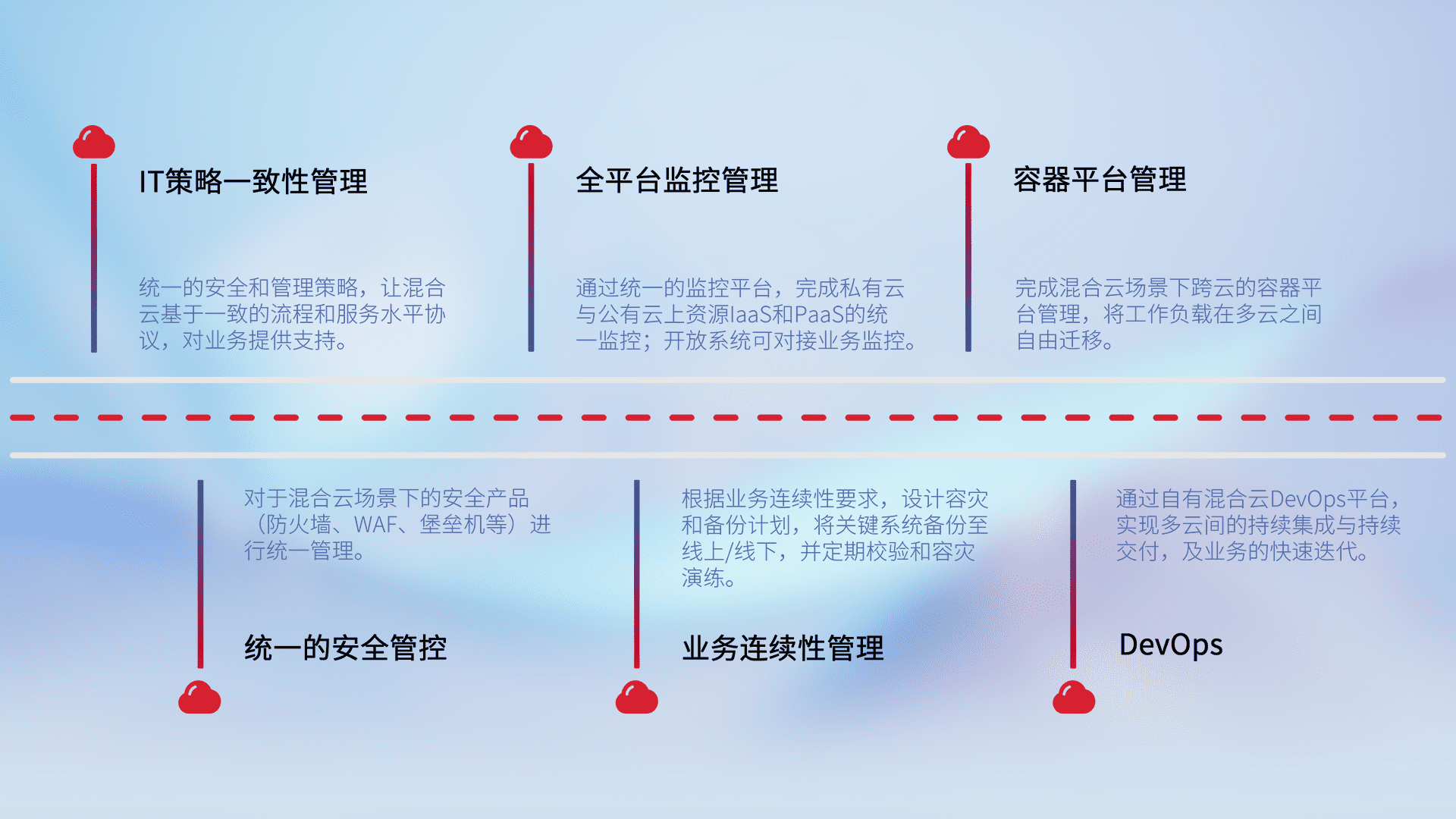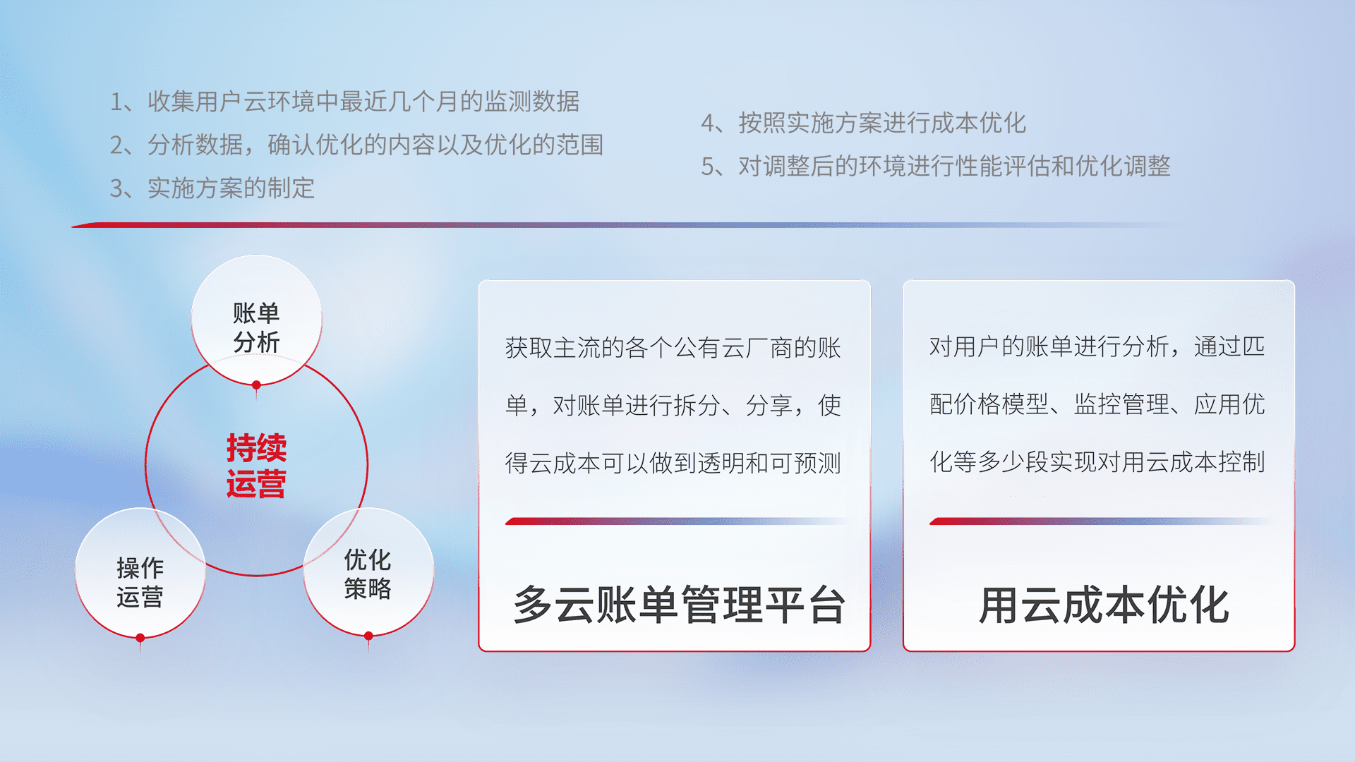 通过多云纳管,,以统一的资源数据模型把客户的云资源进行抽象和封装,,,进而实现对多云资源的统一操作,,,,保障云资源管理的可靠性、、稳定性与可用性。。量身定制化运维内容,,,配置、、开发运维、、、、补丁管理、、、备份、、、监控、、、、认证和访问管理、、审计和日常巡检等,,,,保障在用云过程中的可靠度,,,稳定度以及高可用率。。。